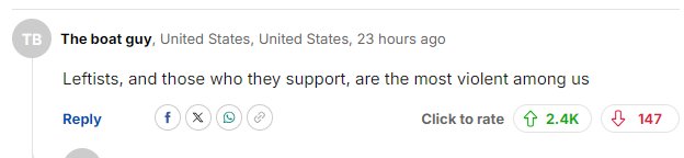 “左派和右派的言辞——尤其是左派的,已经疯狂到极点。不断喊别人是纳粹、是威胁民主的法西斯,那么当有人真的开枪时,他们会觉得自己是在为社会除害。”
