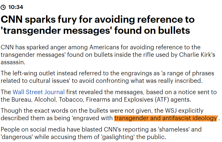媒体争议:CNN 报道时将子弹刻字轻描淡写为“文化口号”,遭社交平台抨击为“掩盖真相”。
