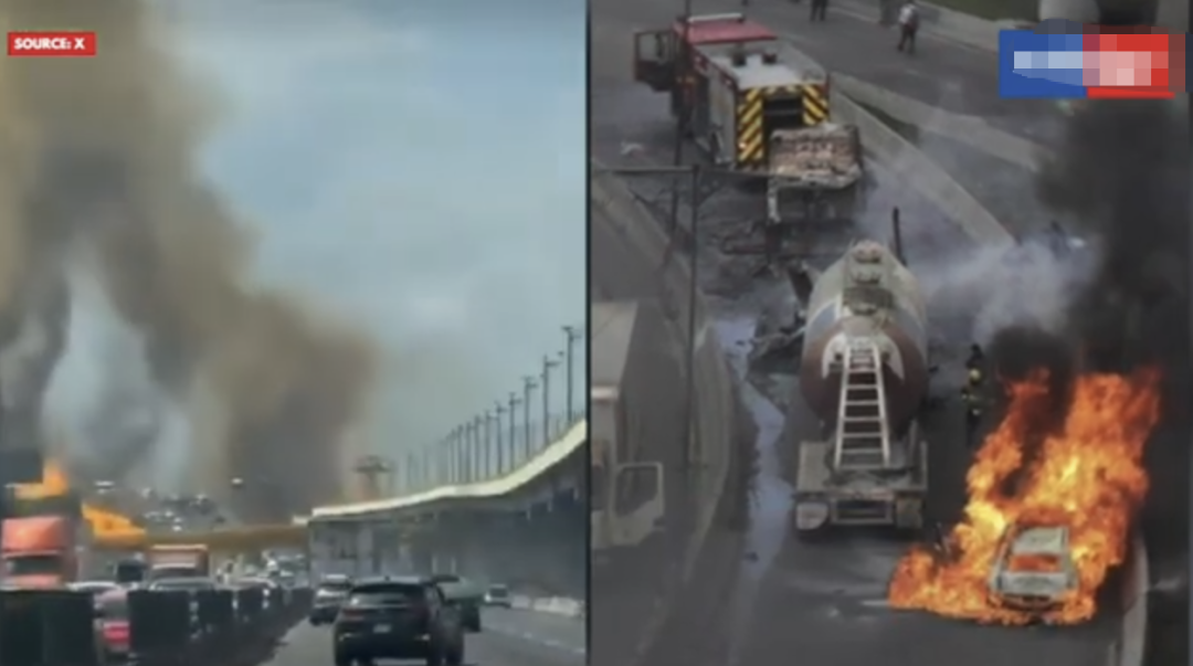 事故现场在墨西哥城东部伊斯塔帕拉帕区“团结桥”下面的一条主要高速公路,这辆燃气槽罐车突然失控翻车,发生燃气泄漏,瞬间原地爆炸,引发大火。