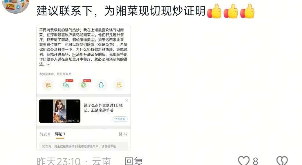 “平民消费级别的锅气热炒,我在上海最喜欢锅气湖南菜,在深圳最喜欢农耕记湖南菜。他们都是连锁餐厅,都开进了商场,都价廉物美。如果这两家企业需要宣传推广,也可以跟我们联系(保证免费),希望你们给公众科普一下,为什么坚持做新鲜热炒,还能盈利,还能开进商场,还能开那么多的店。我现在特别讨厌很多人说在商场里开中餐厅,就必须用预制菜的说法。”