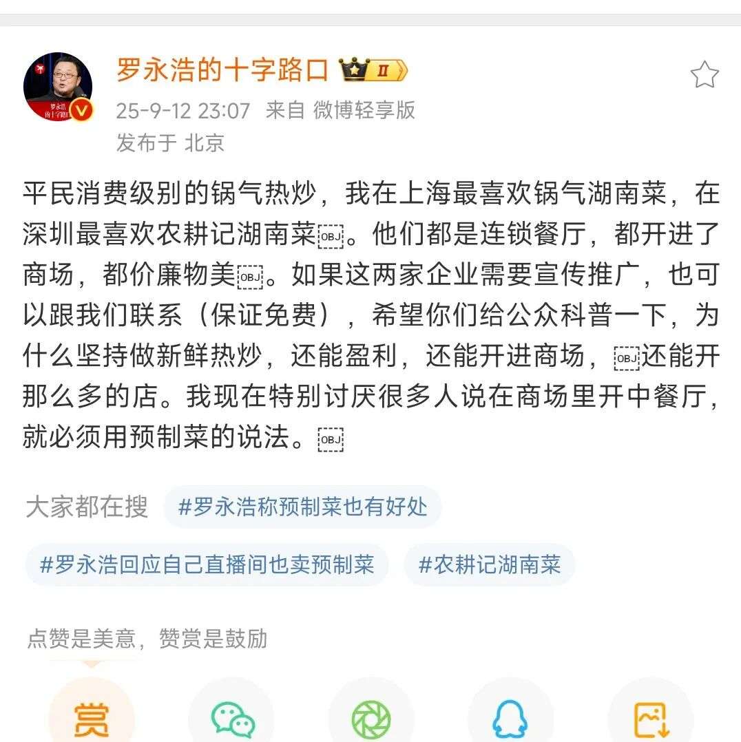 9月12日晚结束直播之后,罗永浩再度就预制菜舆论一事发文: