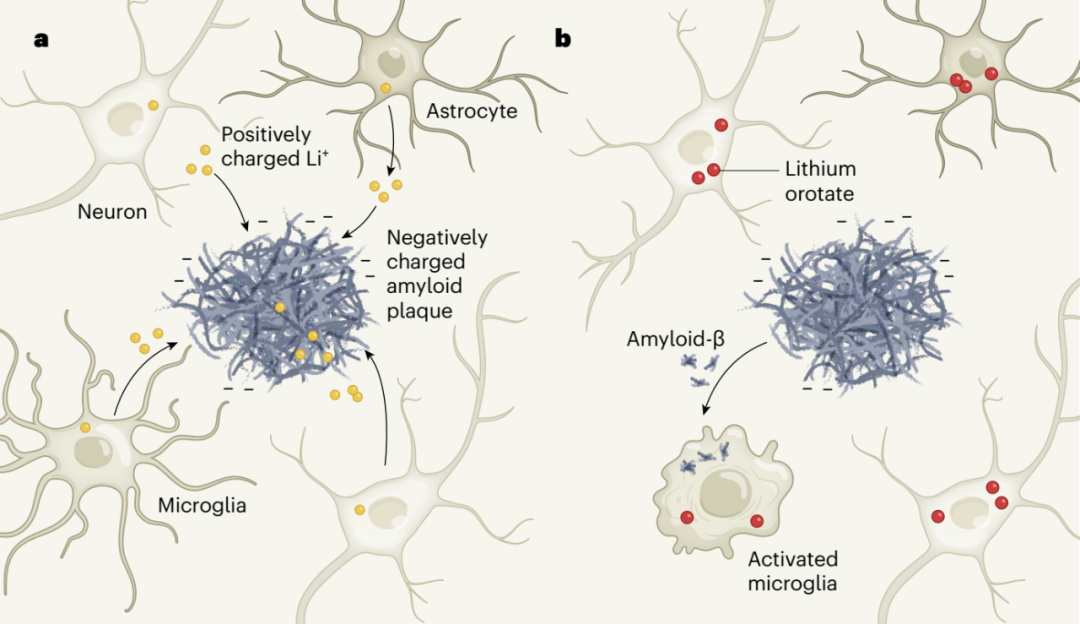 而乳清酸锂(lithium orotate)不易形成锂离子,因此不易被淀粉样斑块捕获,补充乳清酸锂可防止淀粉样斑块的进一步积聚,可能是通过恢复小胶质细胞清除 Aβ 的能力来实现的,并且在阿尔茨海默病和正常衰老的小鼠模型中保护了认知功能的丧失。