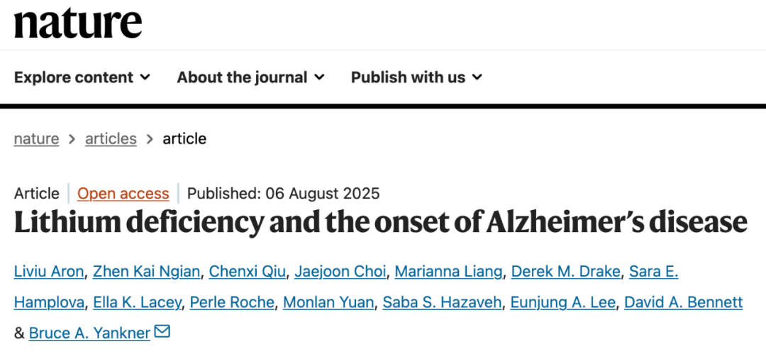 2025 年 8 月 6 日,哈佛大学医学院的研究人员在 Nature 期刊上发表题为Lithium deficiency and the onset of Alzheimer’s disease 的研究论文。