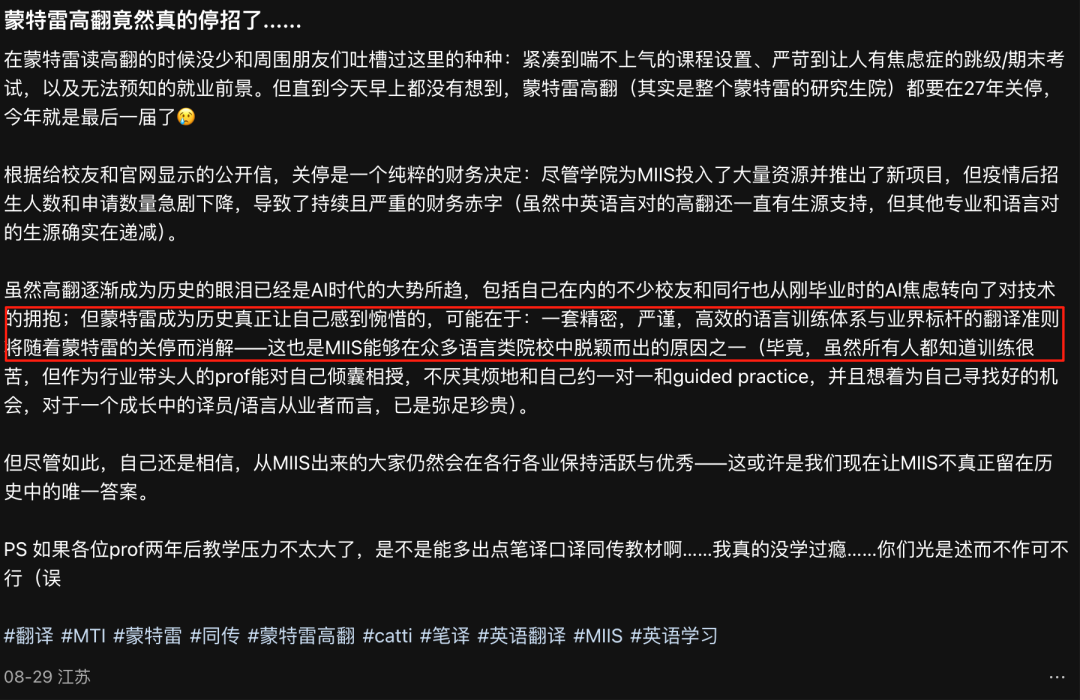 前些天,在业内有“翻译界哈佛”、被无数翻译专业学生视殿堂级学校的蒙特雷国际研究学院(MIIS)突发公告,表示学校目前已经停止招生并将在2027年6月全面停止办学,学校当前的主线任务是确保在校生可以顺利毕业。