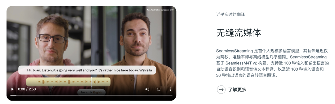 Meta AI旗下的SeamlessM4T,能够在2秒延时内口译上百种语言的语音,利用数百万小时的多语言语音数据预训练SeamlessM4T已经能够识别语言的一般模式,从而在处理使用频率较低的语言时表现得更加出色,更符合人类的说话习惯和理解。