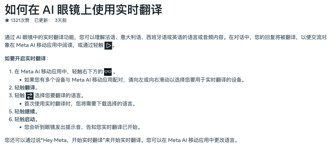 如果说拍摄或者语音操作模式只是把原有的手机操作平移到智能眼镜上,那么实时AI翻译功能绝对是突破性的功能体验,在不进行额外操作下,光是戴着眼镜利用实时语音翻译功能就能进行跨语言对话,这已经无比接近拥有一个随身口译员的体验。