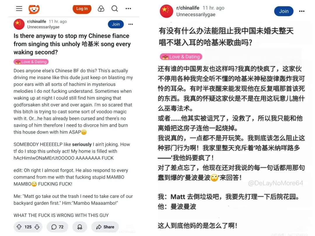 事情的起因是,这位外国女孩在网上向中国网友发出了一则“求救”帖。她抱怨说自己的中国未婚夫对“哈基米”痴迷到极点——不仅手机里塞满了各种版本的“哈基米”串烧,还整天循环播放。