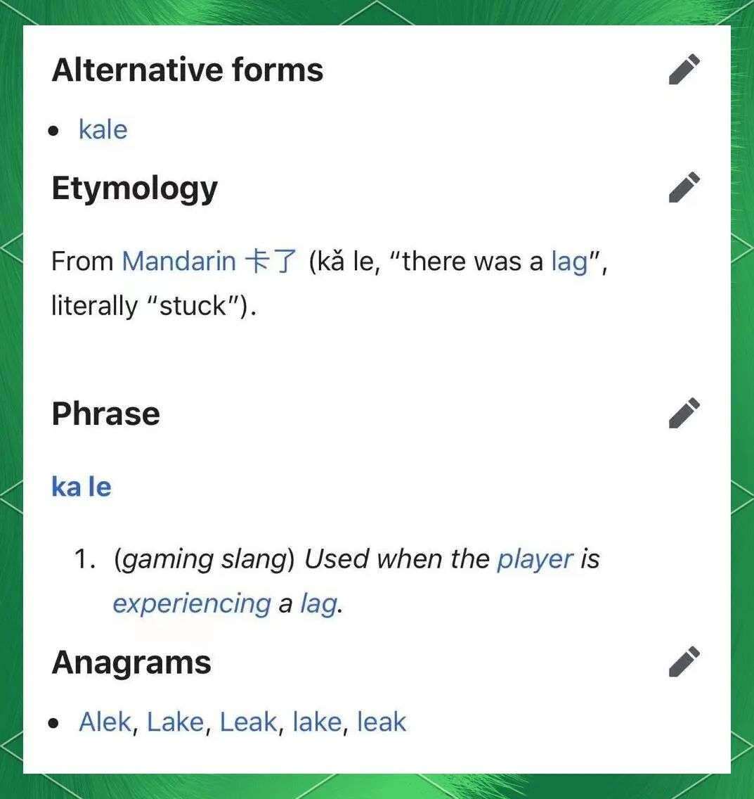 赛后,“ka le”迅速在DOTA圈乃至整个电竞圈流行开来,甚至直接替代了原有的“lag”。最终,“ka le”作为新兴网络词条被维基英语字典收录,成了实打实的“舶来词”。
