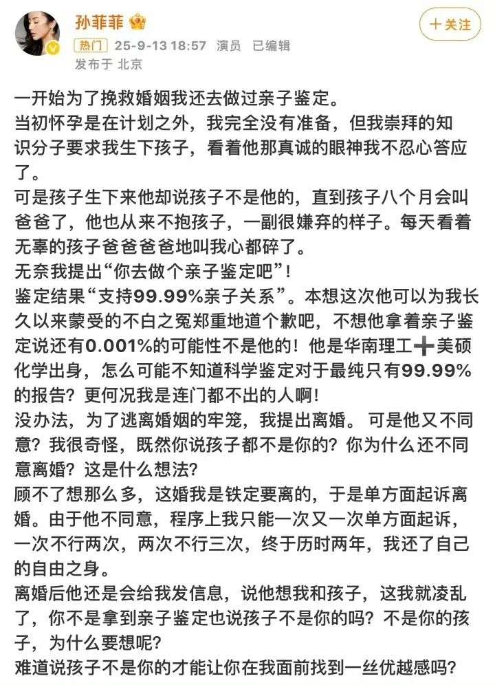 为自证清白,孙菲菲主动做了亲子鉴定。结果显示“支持99.99%亲子关系”,这本是生物学黄金标准。