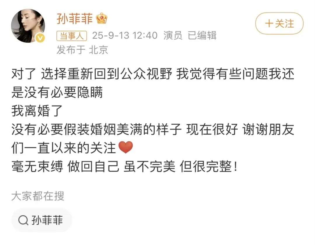 如今宣布离婚,对孙菲菲来说是一种解脱。她坚强表示:“虽不完美,但很完整”,终于告别这场需要自证清白的荒唐婚姻。