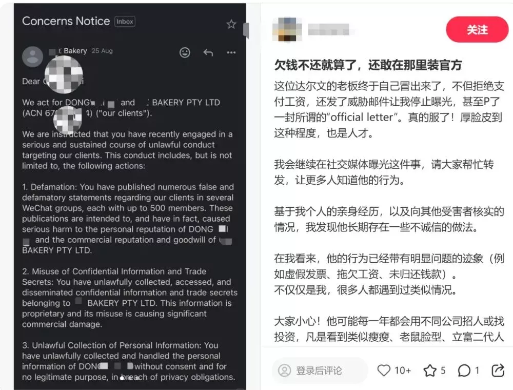此外,他还拖欠建筑商XXXXX PROJECTSOLUTIONPTYLTD上万元澳币,同样试图用假发票蒙混过关,失败后导致工程停工;因欠款从North Lakes Shopping Centre跑路,且被Casurina Shopping Centre终止合同;另拖欠一名教育系女性合伙人数万元澳币,多名曾为其工作的人至今在辛苦讨薪。