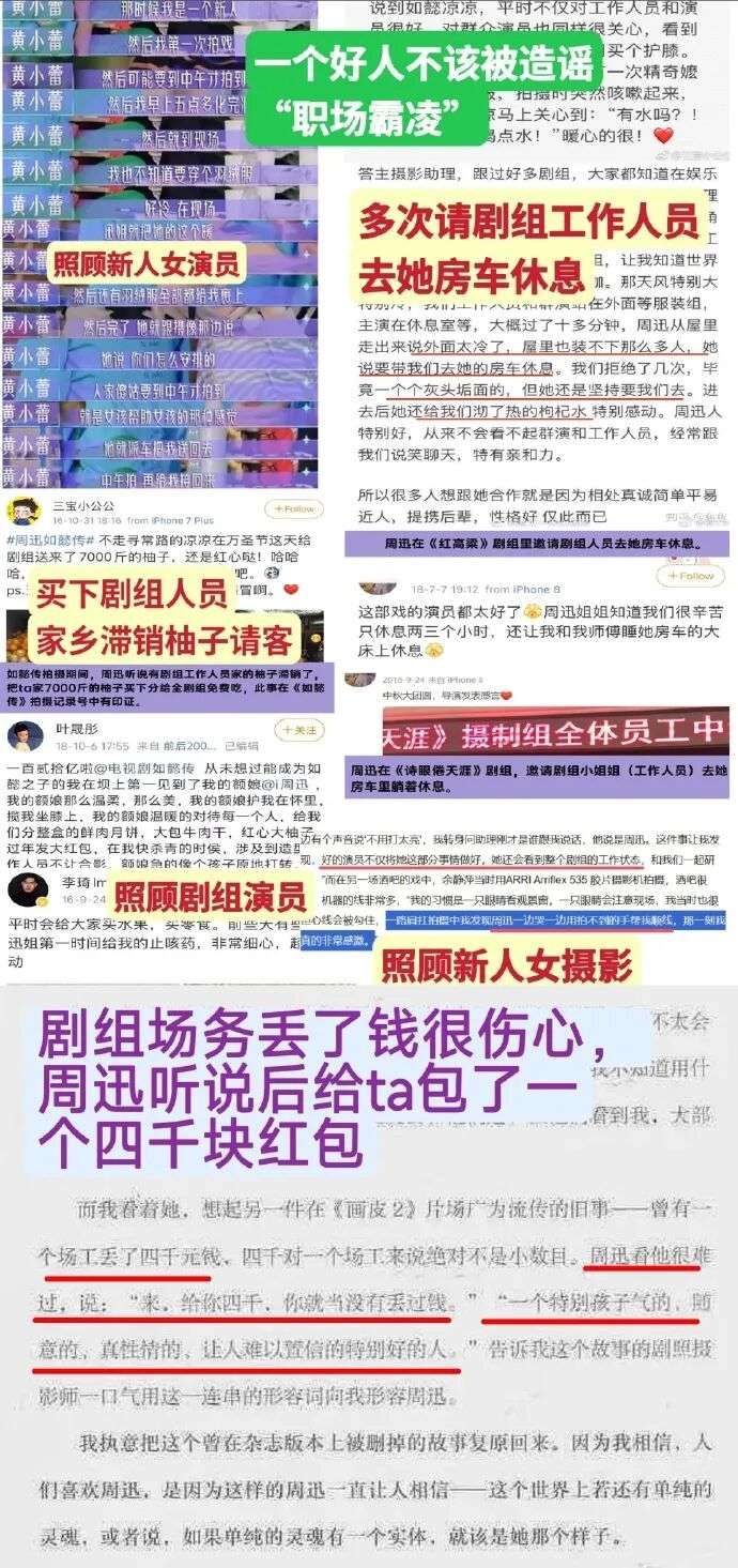 多位《如懿传》演员提到过剧组氛围有爱和谐,周迅在剧组里很照顾其他演员。周迅对职场新人和剧组普通工作人员历来也非常照顾,一个主动邀请普通工作人员上房车休息、为安慰丢钱场务送几千元红包的人,何以被如此恶毒造谣为“霸凌者”。