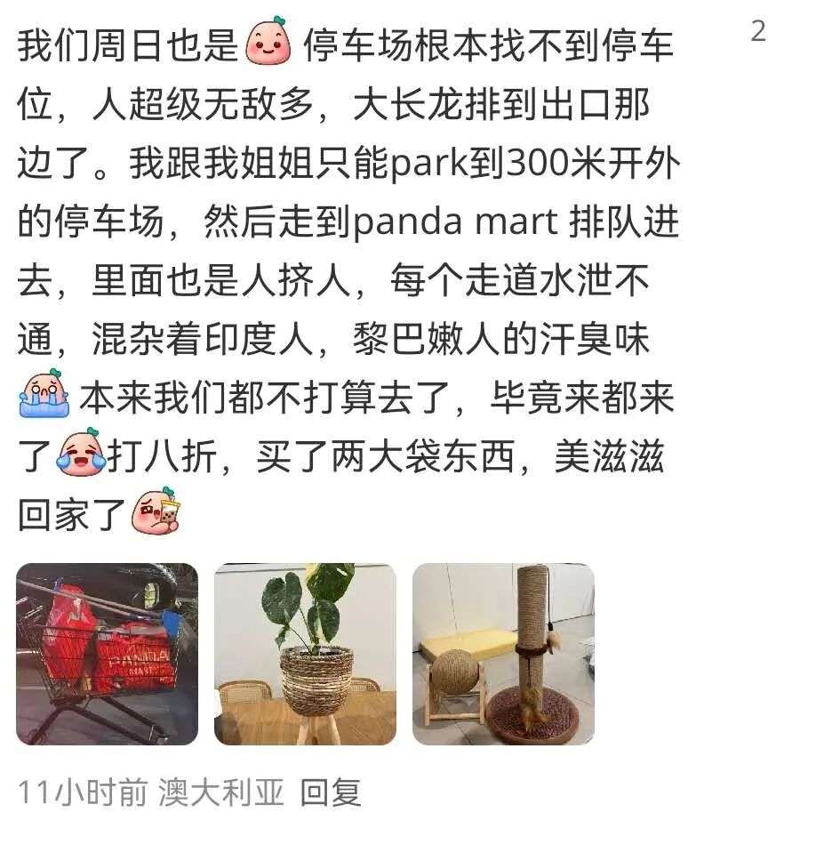 我们周日也是,停车场根本找不到停车位,人超级无敌多,大长龙排到出口那边了。我跟我姐姐只能park到300米开外的停车场,然后走到panda mart 排队进去,里面也是人挤人,每个走道水泄不通,混杂着印度人,黎巴嫩人的汗臭味。本来我们都不打算去了,毕竟来都来了打八折,买了两大袋东西,美滋滋回家了。