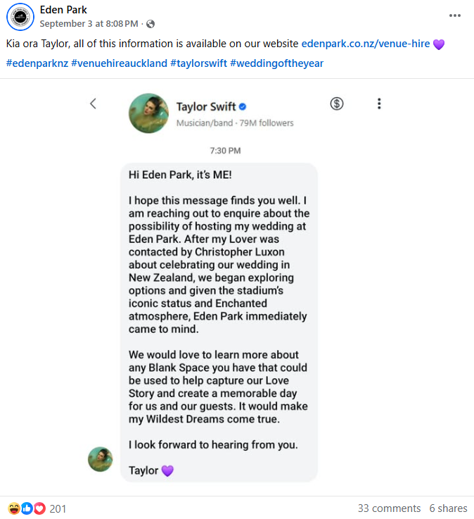 随后,奥克兰华人熟悉的、承办无数体育运动赛事和演唱会伊甸公园场馆(Eden Park)也“蹭了一波流量”——仿造Taylor Swift发私信的截图,引导大家去看自己的场地租赁信息。
