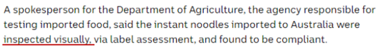 另一边,负责检测进口食品的机构澳洲农业部的一位发言人表示,这些方便面通过标签评估进行了目视检查,发现符合要求。