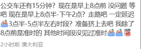 据华人吐槽,澳洲公交车经常不准时,尤其是在非高峰时段,延误是家常便饭。
