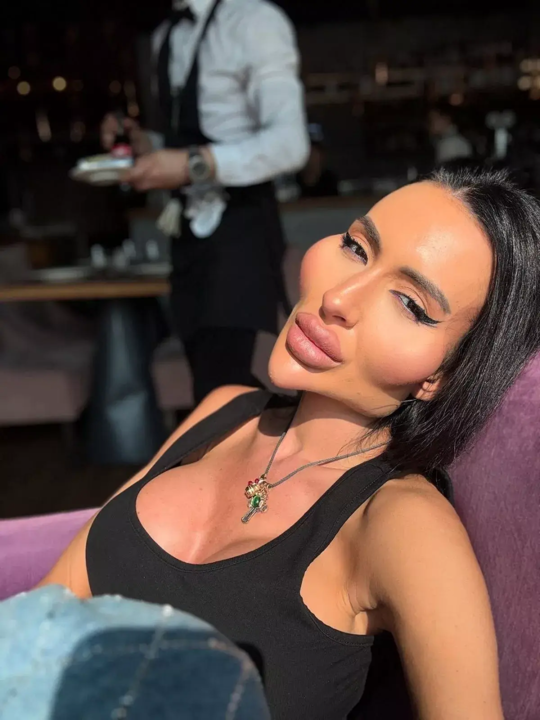 颧骨注射让她的脸颊高耸、甚至达到夸张的视觉效果;唇部填充让嘴唇始终保持饱满;