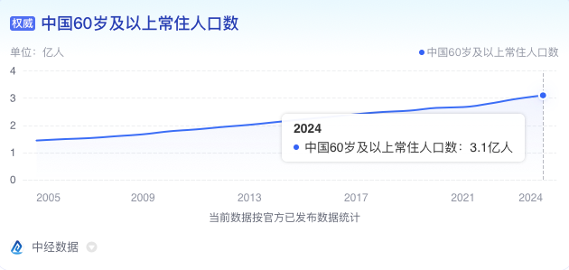 截止到2024年,中国60岁以上的常住人口数有3.1亿人。