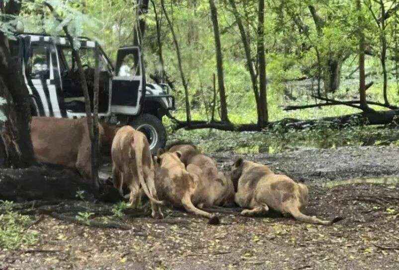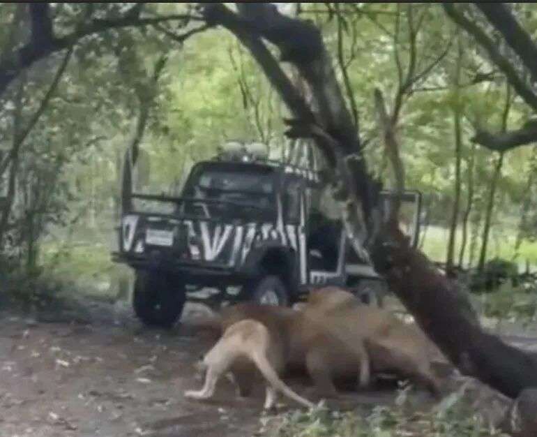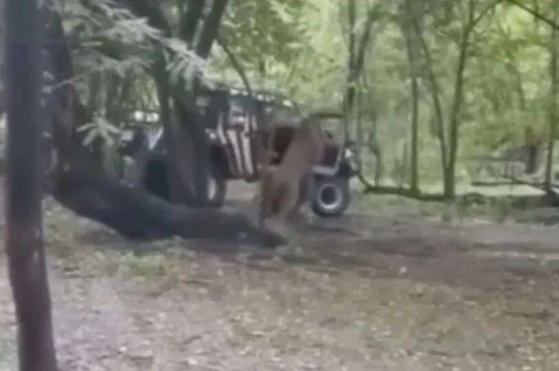 一辆搭载员工的工作车突然开进了狮子区,并且这辆车的车窗还是拉下来的。