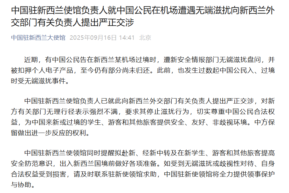 收藏中国公民在新西兰机场遭遇无端滋扰盘问,中使馆发声:提出严正交涉,对无理行径表示强烈不满