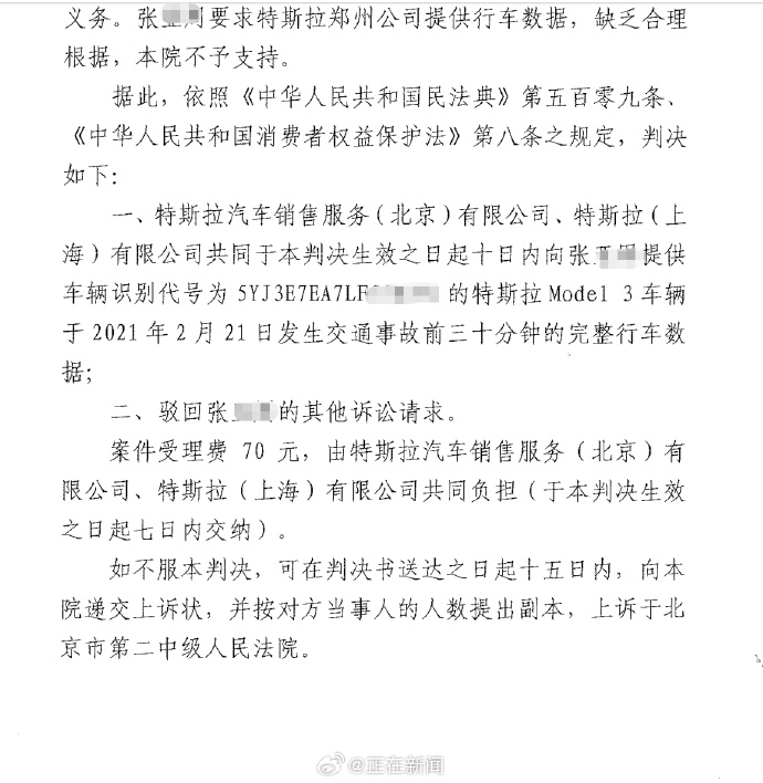 2025年9月16日,北京市大兴区人民法院就张女士诉特斯拉汽车销售服务(北京)有限公司等买卖合同纠纷一案作出判决,认定特斯拉作为经营者应保障消费者的知情权,责令其向张女士提供事故前三十分钟的完整行车数据。