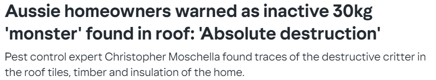 Ref: https://au.news.yahoo.com/aussie-homeowners-warned-as-inactive-30kg-monster-found-in-roof-absolute-destruction-011105942.html