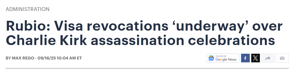 在稍早接受福克斯新闻专访时,鲁比奥已暗示过这一举措。他说:“如果我们邀请某人以学生、游客或其他身份来到美国,他们必须符合很高的标准。我们不应该给那些会庆祝政治人物被谋杀的人发放签证。如果他们已经在这里,我们就该撤销他们的签证。”