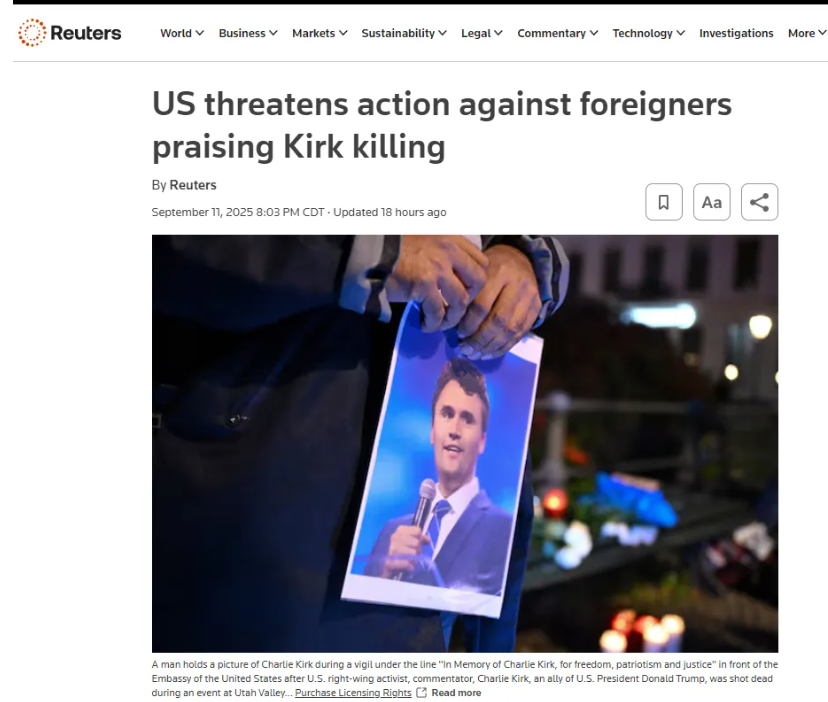 相关阅读:言论自由≠为暴力叫好!美国国务院警告:外国人庆祝刺杀恐失签证,中文社交媒体也能当证据