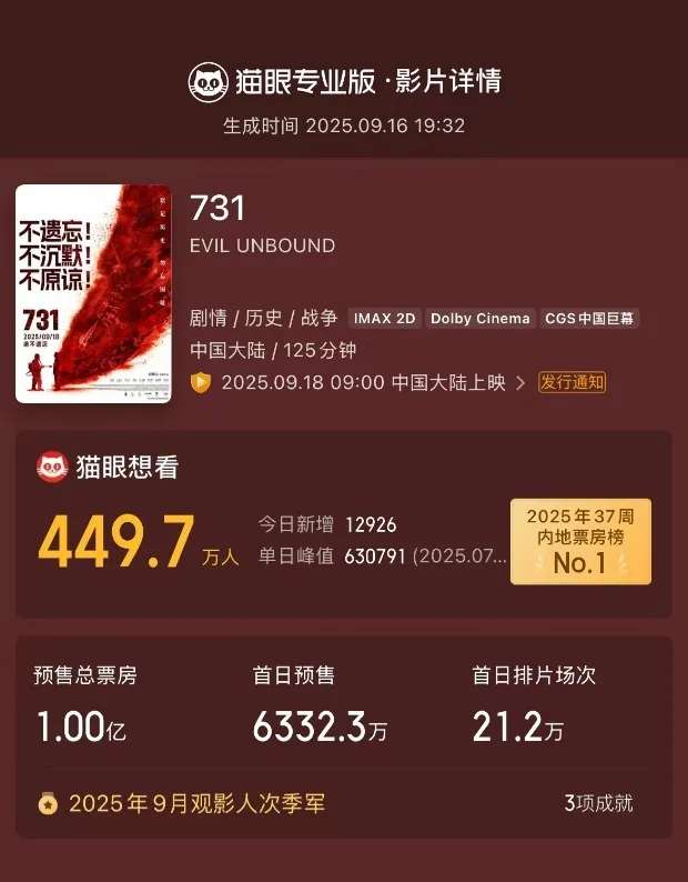 据了解,《731》公映时长为125分钟,9月18日9:00起片。
