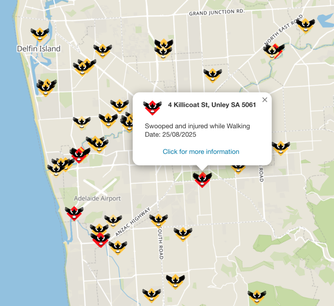 (Magpie Alert 地图截图:黄色代表有俯冲案例,红色标记代表有受伤案例)