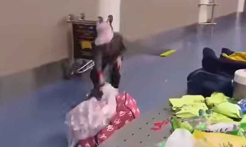 但之后,她更是情绪失控,抓起行李箱里的东西,一件件砸在地上,还一直说脏话。