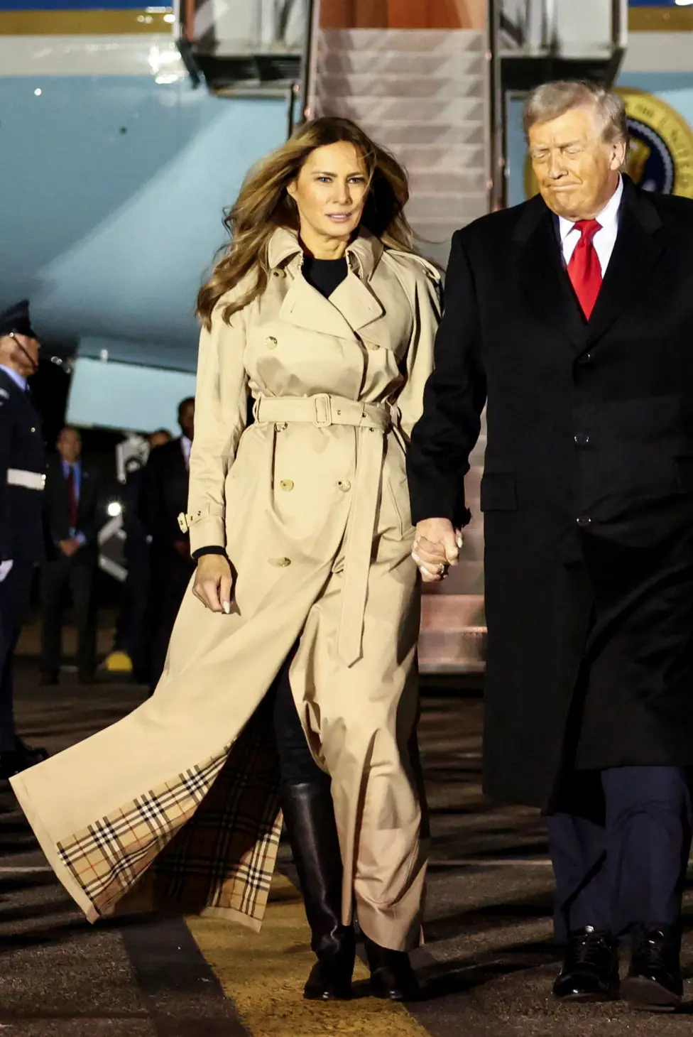 她在周二一踏上英国土地时,就身穿了一件巴宝莉经典风衣——蜂蜜色、及地长、翻起的衣领配上标志衬里,搭配黑色墨镜和靴子,完全是时尚大片级别的登场。