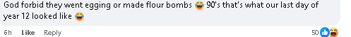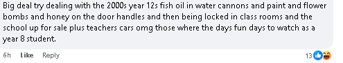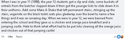 “90年我上高二的时候,高三的学长学姐才是真的‘野’。他们弄了个滑水道,浇上屠夫店拿来的内脏,让学弟学妹穿着校服去滑。还搞奶昔染色、在楼梯拉绳子、把卫生间马桶盖涂满Vegemite、马桶口还套保鲜膜……简直花样百出。等我们自己到高三,学校直接禁止我们进校门,就给了一顿‘鸡肉橙汁早餐’加个充气城堡。想想打扫那个城堡里满地的鸡肉和橙汁就觉得惨。”