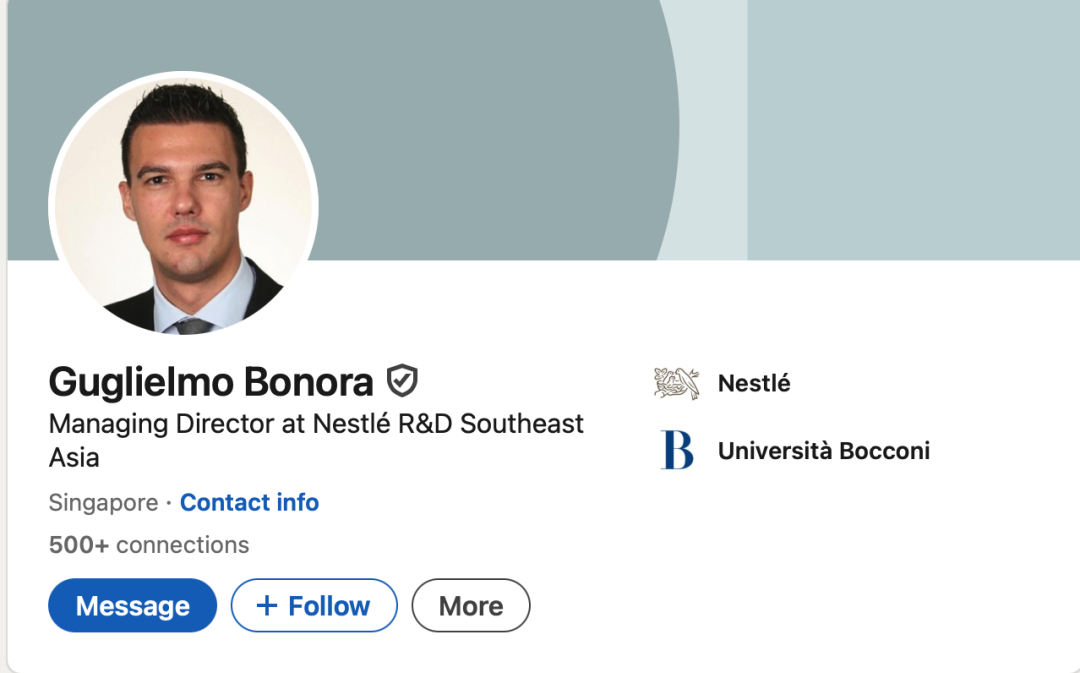 记者查询发现,Guglielmo Bonora在雀巢工作已超过19年,他从内部审计师做起,此后曾负责营销、市场等方面的业务,工作地点包括迪拜、新加坡等,在研发岗位上工作已有近5年。