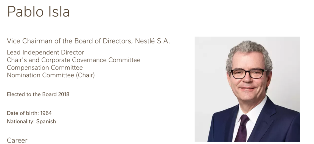 对比这两位新高管的履历可以发现,Philipp Navratil是一路从雀巢成长起来的“老员工”,Pablo Isla则在2018年才加入雀巢集团董事会,此前其在ZRAR品牌母公司Inditex集团担任首席执行官超过十年。