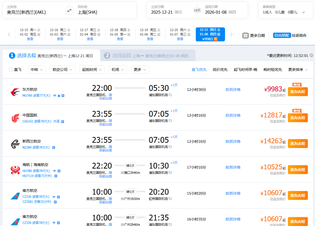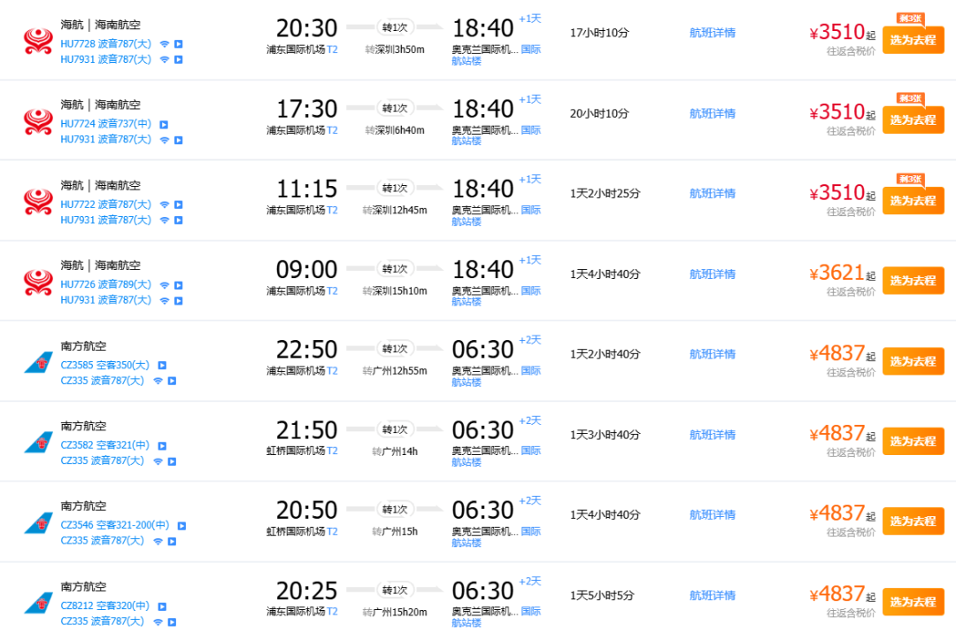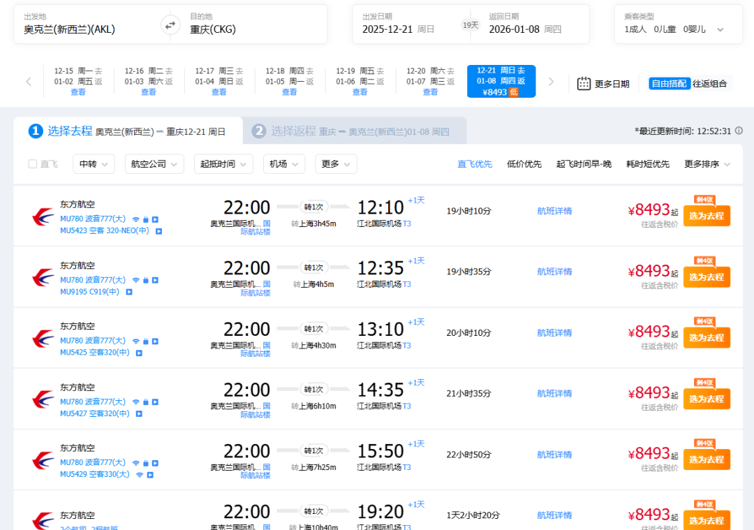 以圣诞节假期期间,奥克兰往返中国的机票为例——同样以东航MU780为首班航班,飞往上海的往返票价普遍为10000+人民币;