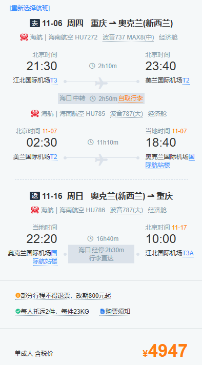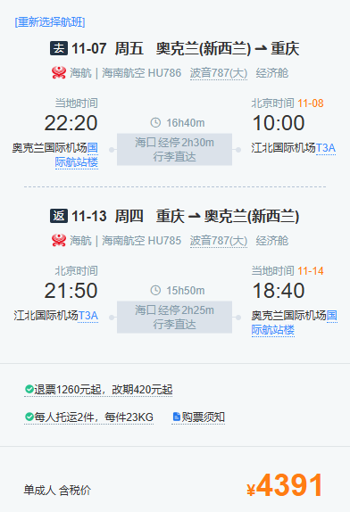 每周四、周六21点55分从重庆江北国际机场起飞,经停海口后,于次日18点10分抵达奥克兰;