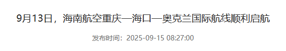 根据海南航空最新消息,重庆—海口—奥克兰国际航线于9月13日正式启航!
