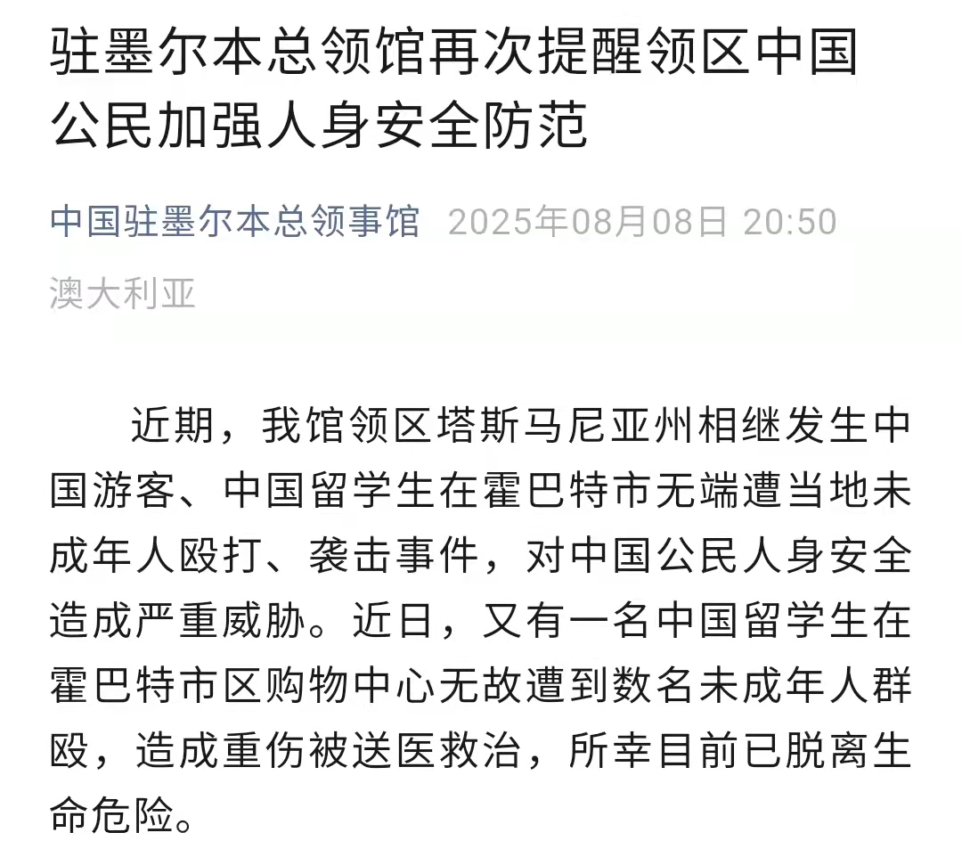 频繁的遇袭事件让人担忧。前段时间,中国驻墨尔本领馆还特别发出提醒,呼吁中国公民加强人身安全防范。