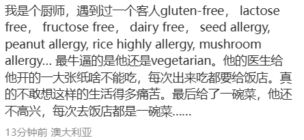 一位华人厨师透露:他曾遇到一位客人,其饮食限制包括无麸质、无乳糖、无果糖、无乳制品、无种子、无花生、无大米、无蘑菇,同时还是素食主义者。