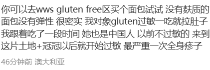 有部分华人表示,此前在国内从未有过过敏症状,但来到澳洲后,逐渐出现麸质过敏,最严重时全身起疹。
