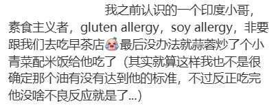另一位网友提到,一位印度朋友既是素食者,又对麸质和大豆过敏,最终在早茶店只能选择蒜炒小青菜配米饭。
