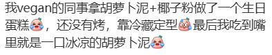 但也有失败案例,华人网友分享一位素食同事用胡萝卜泥和椰子粉制作了冷藏生日蛋糕,口感令人失望。
