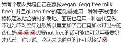 一位网友分享,其朋友使用种子粉模拟蛋液质地,以杏仁奶或燕麦奶替代乳制品,制作口感尚可的无过敏原蛋糕。