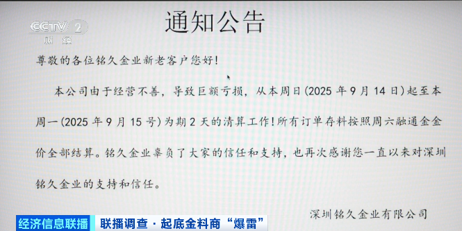 记者了解到,目前已有多家黄金原料供应商在网上发公告,称公司由于经营不善,导致巨额亏损,正在进行清算工作,所有订单存料按照9月13日融通金金价全部结算。