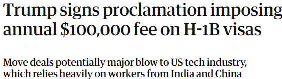 这项被称为“10万美元政策”的新规目的是防止雇主滥用H1B名额,一经公布,立即在全球范围内引发轩然大波,尤其在印度和中国技术群体之间掀起巨大震动。