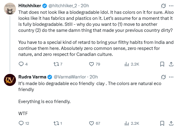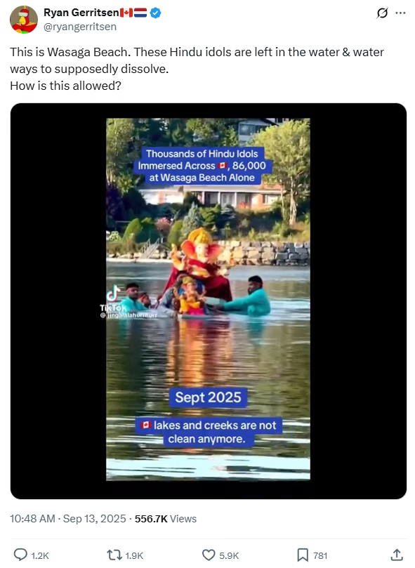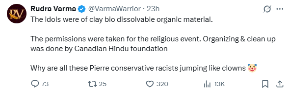 有位印度教徒@Rudra Varma在X上解释说:“这些神像是用黏土和可降解材料做的,这次活动有许可,加拿大印度教基金会负责清理。别把正常的宗教活动说得像环境犯罪。”
