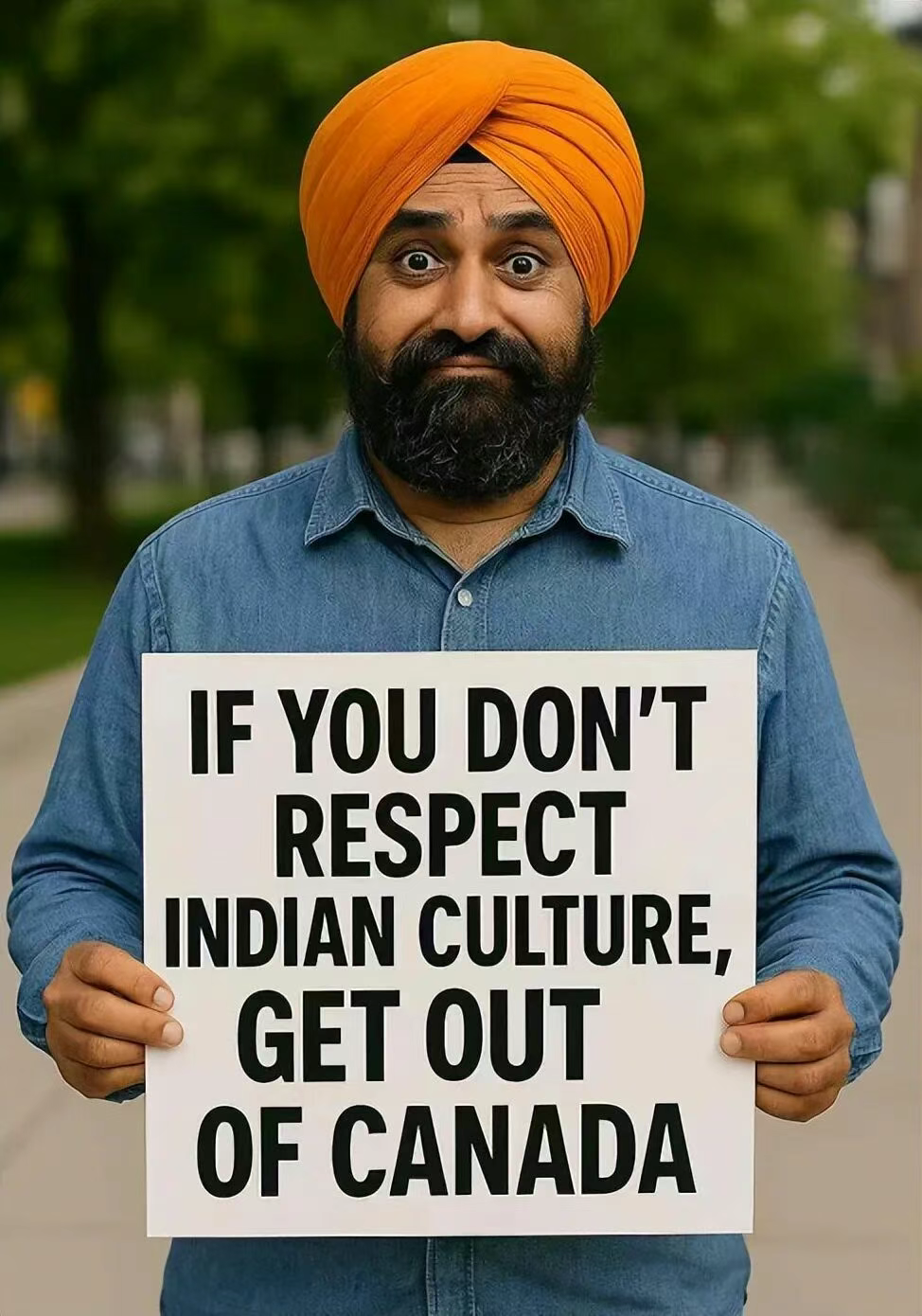 社交媒体上,一张AI表情包更是被疯狂转发:画面里,一个男子穿着印度传统服饰,手举牌子写着——“如果你不尊重印度文化,请你滚出加拿大。”