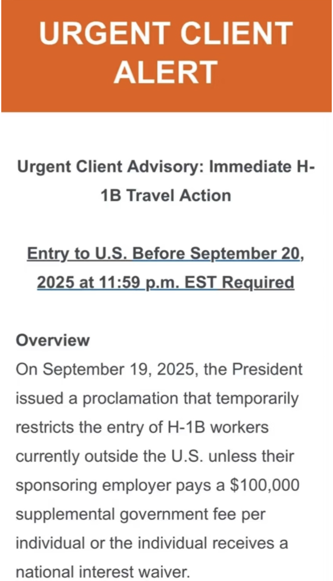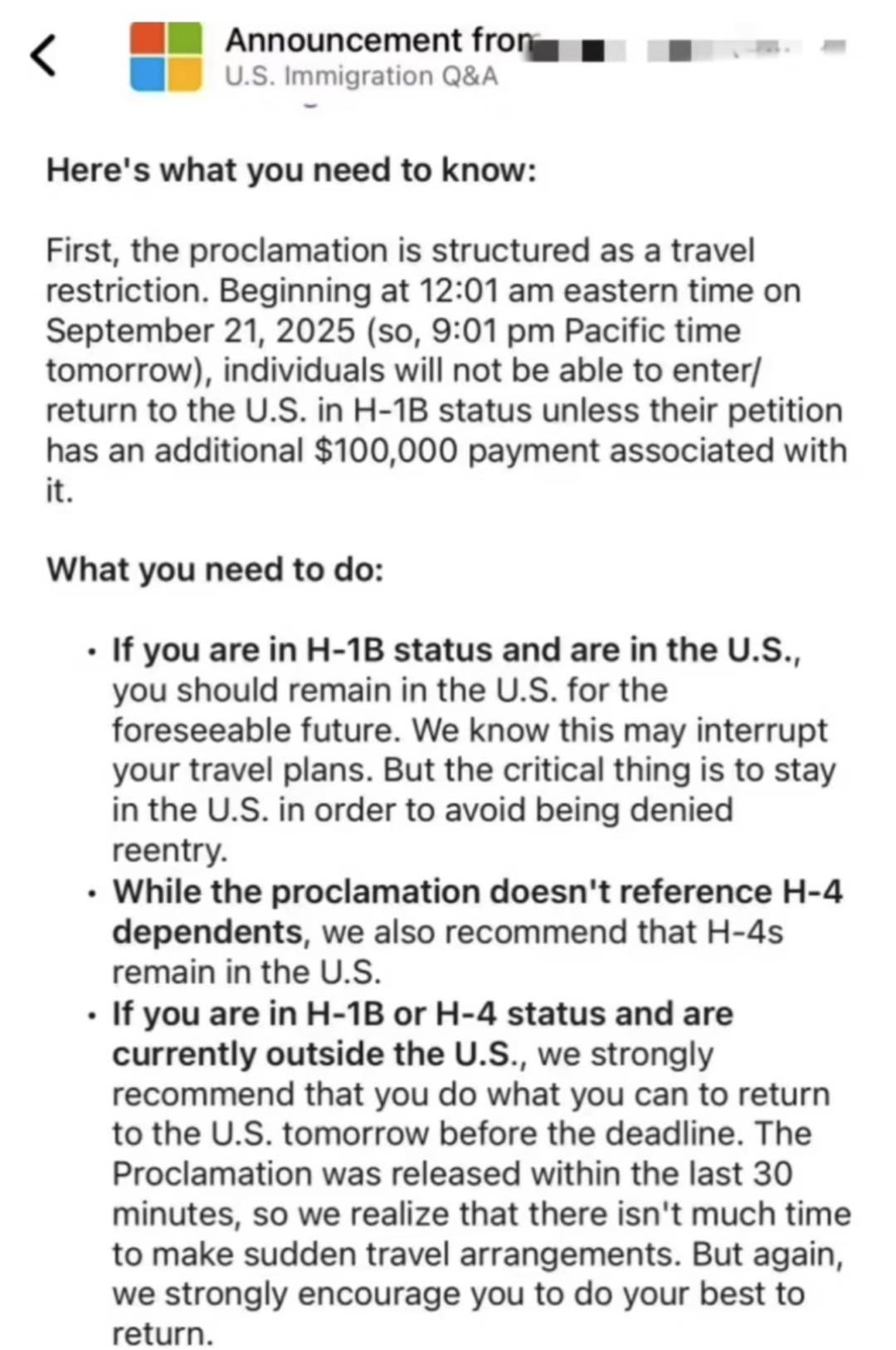 不少机构紧急给国际员工发邮件,建议不要离境美国;而身处海外的签证持有人更是被告知“务必在9月21日午夜前返美”。