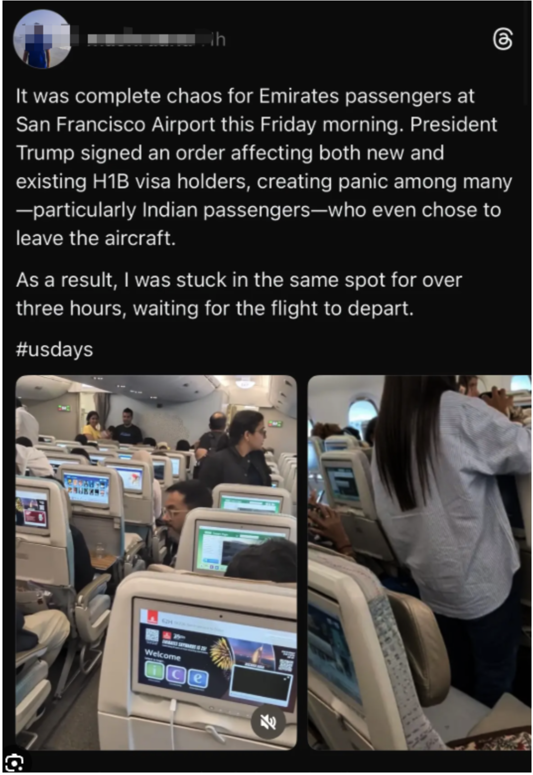 随着消息传出,社交媒体上还涌现出大量印度乘客在美国机场中途下机的情况:旧金山国际机场,一架阿联酋航空(Emirates)满载湾区印度乘客的国际航班刚完成登机。机上突然爆发恐慌,乘客纷纷哀求下机。机上的乘客在得知重新入境的截止期限后,短短20分钟内就有10至15名乘客下机。